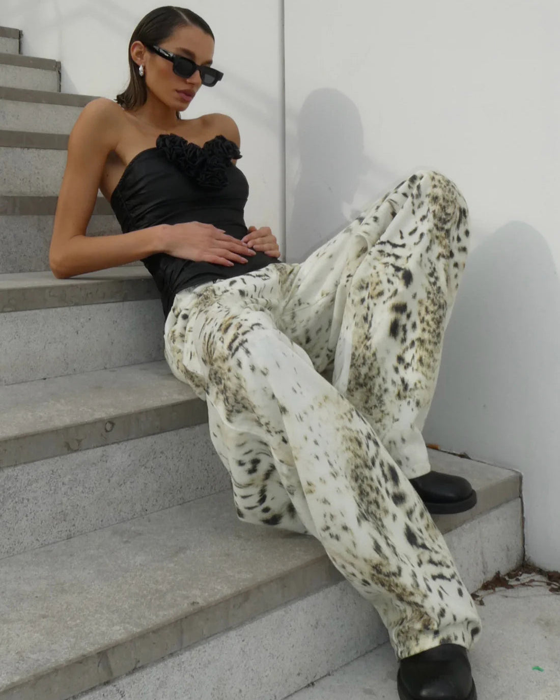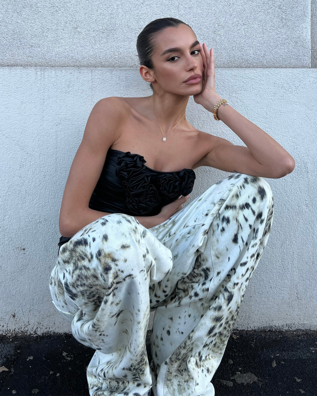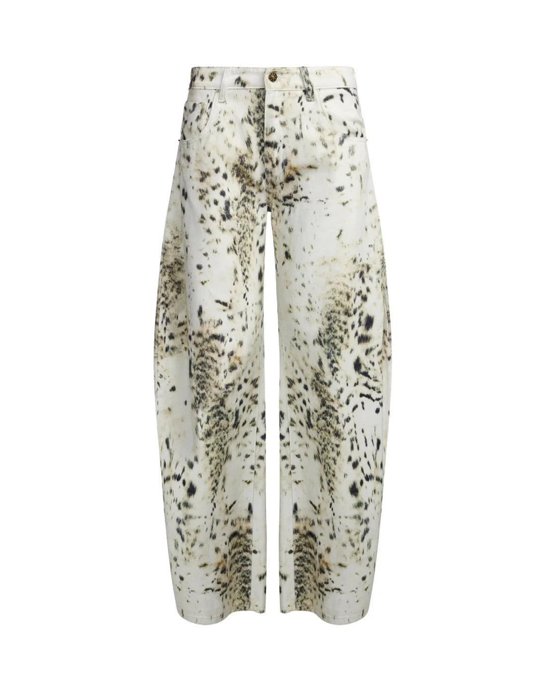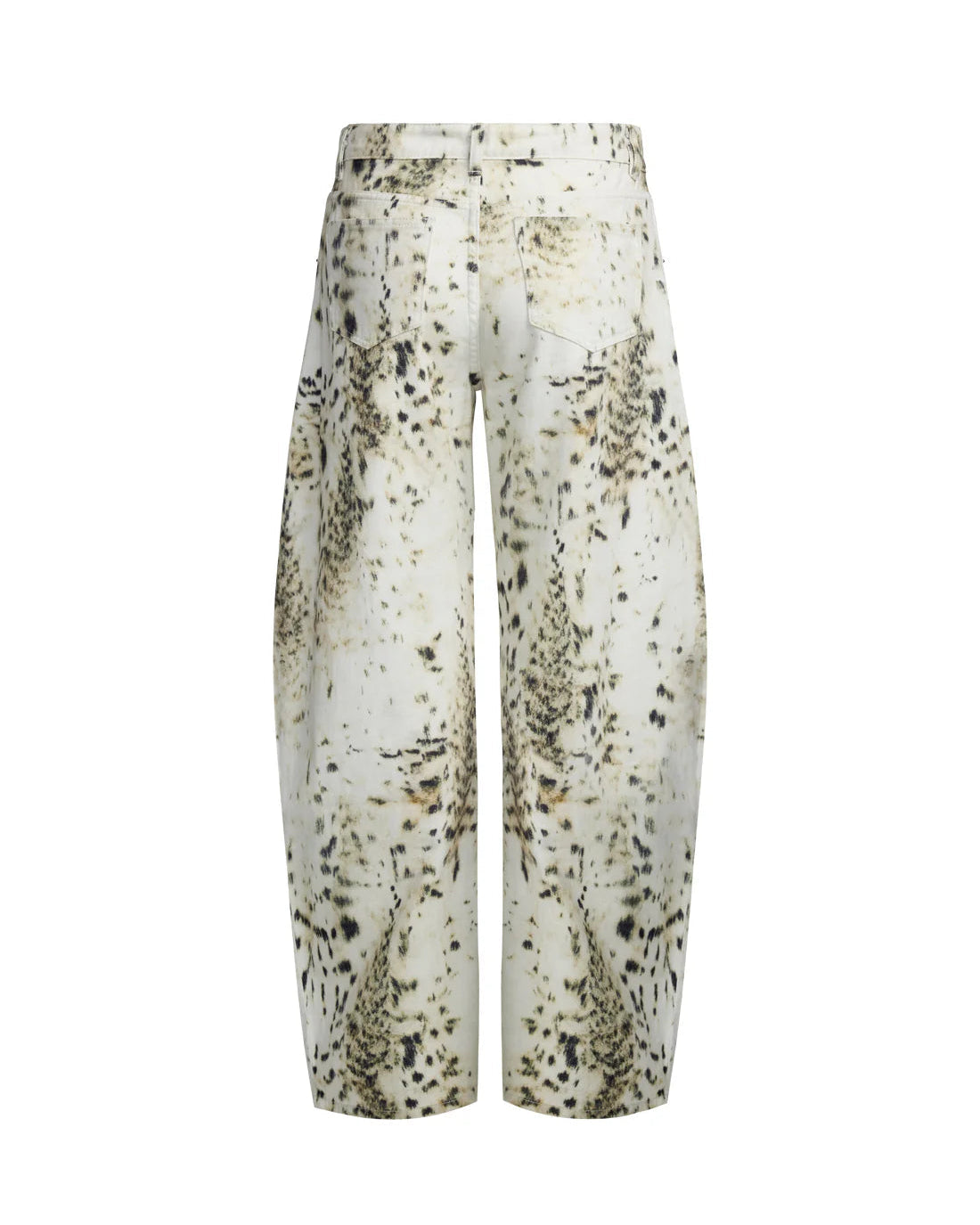 מכנסי ג'ינס בהדפס פרסה מיוחד, בעלי גזרה רחבה ומעט נמוכה, בשילוב כיסים צדדיים וסגירת רוכסן
